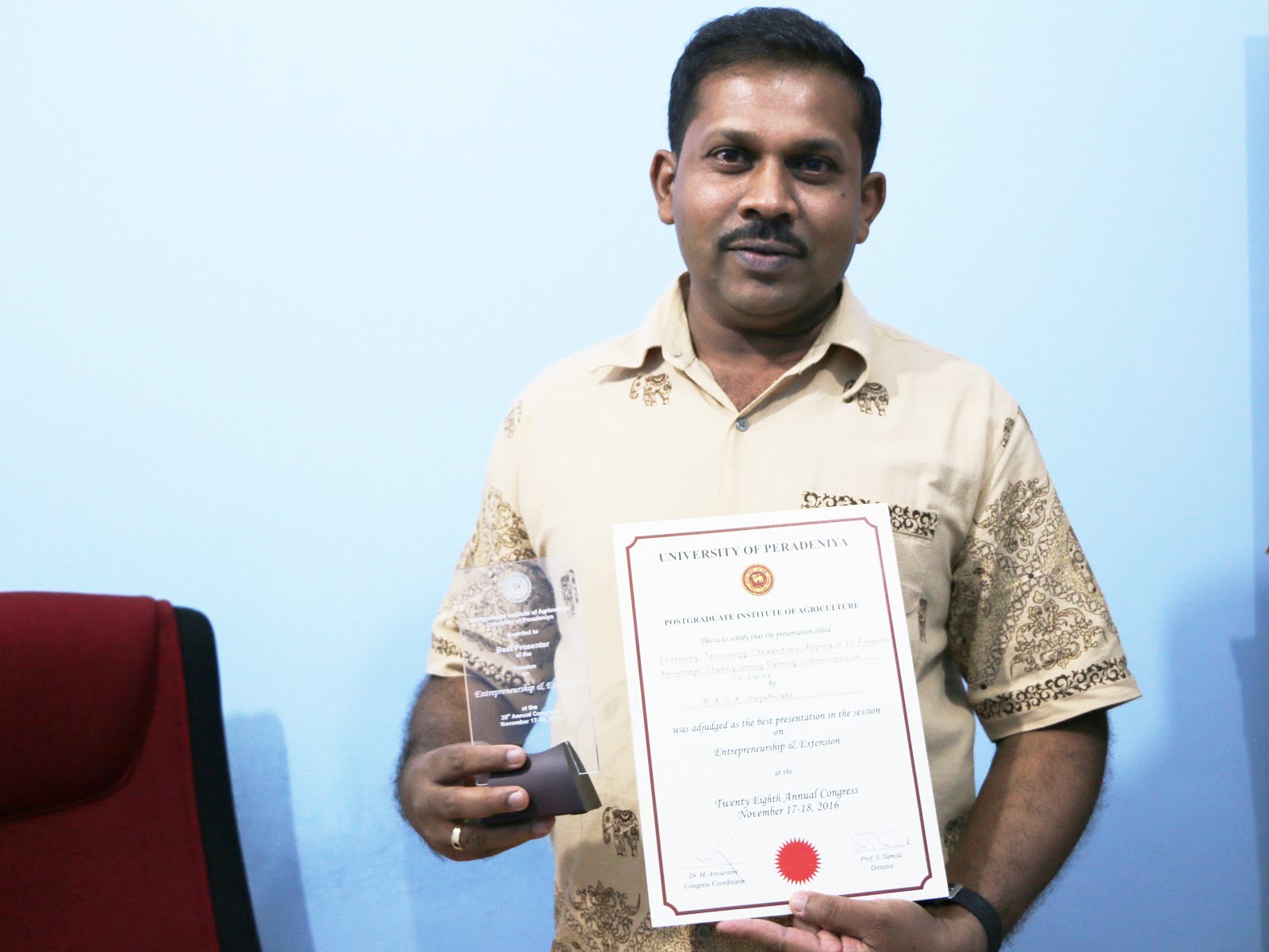 A hearty congratulations to team member Chandana Jayathilake, PhD student at Wayamba University of Sri Lanka for receiving Best Presentation award in the "Entrepreneurship & Extension" session at the University of Peradeniya Postgraduate Institute of Agriculture Congress in November.